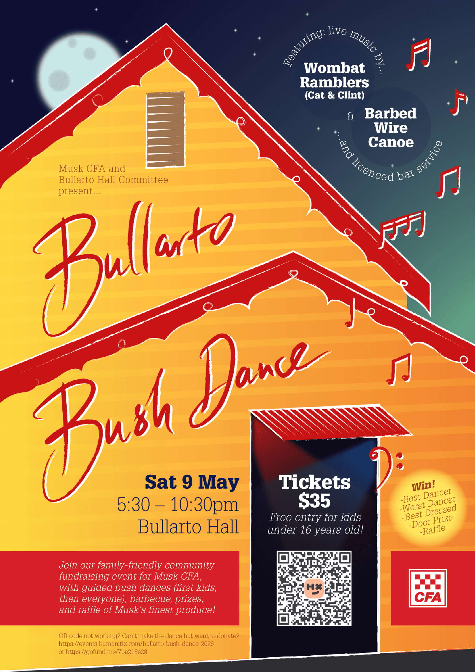 The Musk Fire Brigade and the Bullarto Hall Committee present the family friendly Bullarto Bush Dance once again for 2026! All proceeds go to the Musk CFA to raise funds for the purchase of a Brigade Owned Light Tanker. Since 1943, The Musk Bush Fire Brigade has protected our small but growing community nestled on the Great Dividing Range near Daylesford and Hepburn Springs.