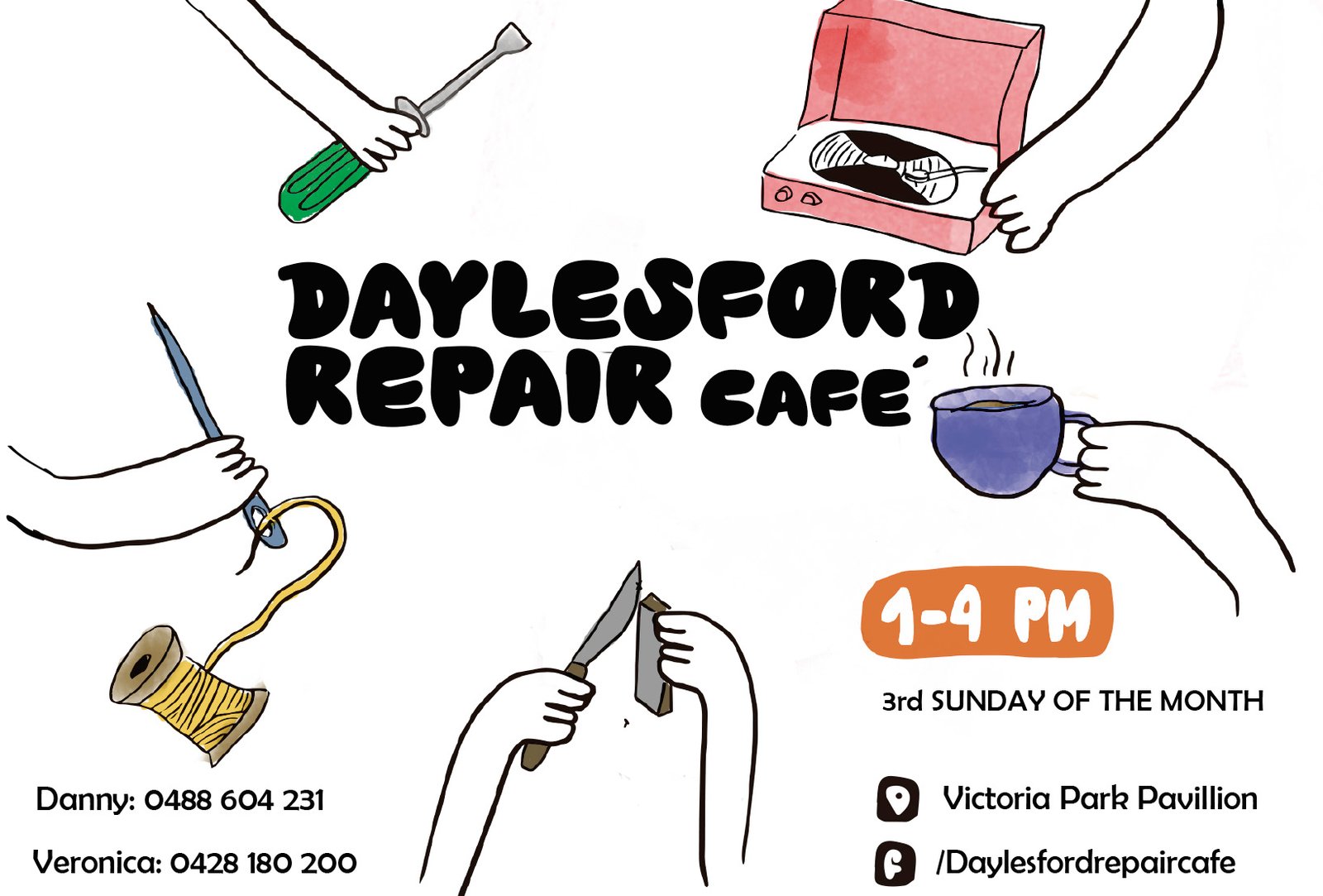 In addition to the Workshop there’ll be the usual repair stations- mechanical, knife and tool sharpening, electrical, clothes, household items and more, plus cuppas and cakes at our Cafe.